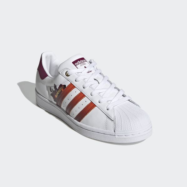 The 50-year legacy of the Superstar Shoes comes with changing scenes, countless players and a pretty killer soundtrack of songs that mention the iconic trainers. They've never been defined by one person, place or thing, and they're not about to start now. HER Studio London gives the iconic rubber shell-toes a floral dip, adding warm tones and golden details to the unmistakable look.